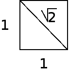 והנה, כבר בריבוע החביב צץ לנו מושג האי רציונליות ישר לפרצוף, ועוד עם הקטע הבסיסי ביותר שניתן לחשוב עליו בריבוע פרט לצלעות - האלכסון. הקו שמחבר שני קודקודים מנוגדים. גיאומטריה אלמנטרית אומרת לנו שהאלכסון הוא היתר במשולש ישר זווית (ששוקיו הן שתיים מצלעות הריבוע), ואנו משתמשים במשפט פיתגורס (שלא אוכיח כאן, אך אני מקווה שאתם מקבלים כנכון - יש לו למעלה ממאה הוכחות שונות!) כדי לקבל שאורך האלכסון הוא \(\sqrt{1^2+1^2}=\sqrt{2}\).