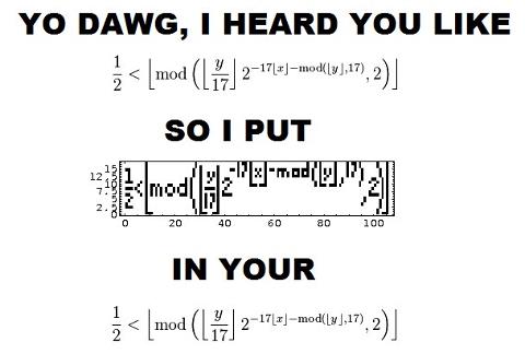רגע, מה? זו תמונה של המשוואה שבעזרתה יצרנו את התמונה מלכתחילה! יש לנו כאן סוג של הפניה עצמית - משוואה שיודעת לצייר את עצמה. הזוי לחלוטין, ומתעלה אפילו על משפטי אי השלמות של גדל ותוכניות המחשב שיודעות להדפיס את הקוד של עצמן!