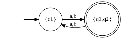 הופס! קיבלנו רק שני מצבים במקום שלושה - איכשהו הדטרמיניזציה זיהתה ש-\(q_{0},q_{2}\) הם אותו הדבר מבחינתנו והם נדחסו למצב יחיד. למעשה, מה שקיבלנו הוא כבר אוטומט עבור השפה שלנו - לא צריך את ההיפוך והדטרמיניזציה הנוספים, והם גם לא משנים את האוטומט כלל (למה?).