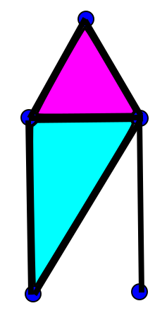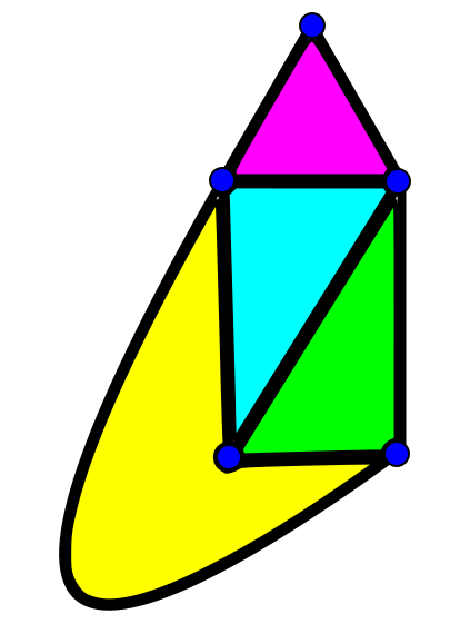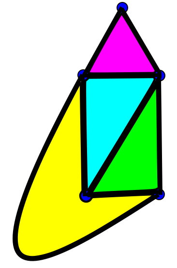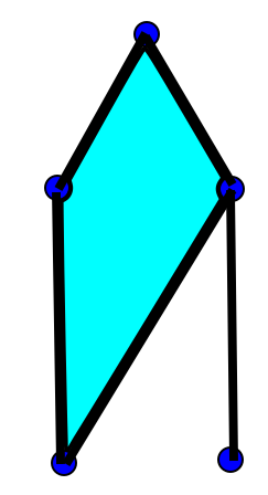 בתמונה הנוכחית צבעתי את הפאות בצבעים עליזים - ורוד, ירוק, כחול, צהוב ולבן. רגע, איפה הלבן כאן? ובכן, גם השטח ש"מחוץ" לגרף נחשב לאחת מהפאות שלו, "הפאה החיצונית". כלומר, הצביעה העליזה שלי מראה לנו שלגרף יש חמש פאות. בנוסף לכך יש לו חמישה צמתים (הנקודות הכחולות) ויש לו שמונה קשתות (הקווים השחורים העבים שמחברים צמתים). אם נסמן את מספר הצמתים ב-\(V\), את מספר הקשתות ב-\(E\) ואת מספר הפאות ב-\(F\) נגלה שמתקיים