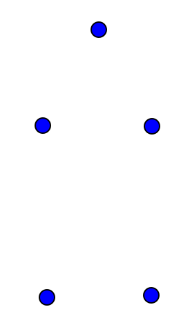 בואו נעקוב אחרי תהליך הציור של התמונה לעיל, עם ספירה של מספר הקשתות והפאות בכל רגע נתון. כל חמשת הצמתים יופיעו כל הזמן - כלומר, \(V=5\) הולך להיות קבוע. בהתחלה יש רק את הצמתים, ודמיינו שאנחנו עומדים בצומת הימני-תחתון ומחכים בהתרגשות לתחילת המסע שלנו בגרף: