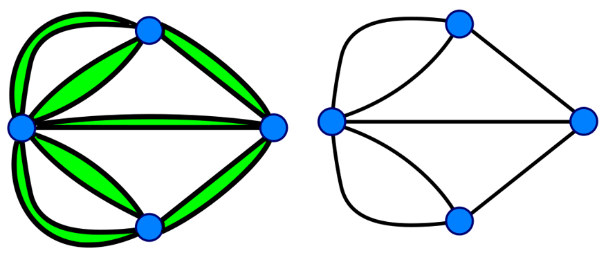 הגרף הימני הוא הגרף המפורסם של "בעיית הגשרים של קניגסברג" שאוילר פתר. כל הצמתים שם מדרגה אי זוגית ולכן הגרף אינו אוילרי, למרות שהוא בבירור מישורי ובבירור מקיים את נוסחת אוילר (\(V=4\) ו-\(E=7\) ו-\(F=5\)). הגרף השמאלי הוא מה שקורה לגרף הימני כשאני לוקח כל קשת ומפצל אותה לשתיים. ההשפעה של הפיצול הזה על הגרף היא זו: