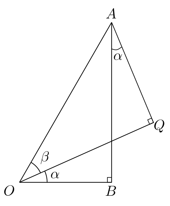העניין הוא ש-\(\alpha\) כבר בתמונה ופשוט לא שמנו לב. בואו נסתכל לרגע על הנקודה שבה נחתכים \(AB\) ו-\(OQ\), שלא נתתי לה שם כדי לא לסרבל יותר מדי: