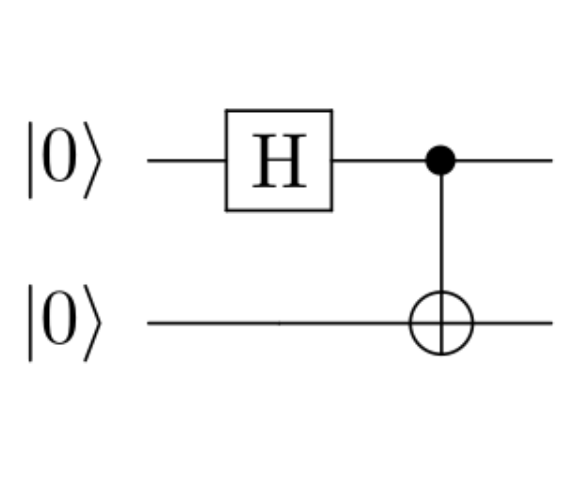 הרעיון בתיאור מעגל כזה הוא שהקיוביטים מסודרים בשורות. השורה הראשונה מתאימה לקיוביט הראשון והשניה לשני. ה-\(\left|0\right\rangle \) שמופיעים בצד שמאל הם הערכים שאליהם מאתחלים את הקיוביטים במעגל. אחר כך כיוון הקריאה הוא משמאל לימין. בהתחלה הקיוביט הראשון נכנס לשער \(H\), בזמן שהשני פשוט "זורם" בלי שיופעל עליו אף שער. אחר כך מגיע שער ה-\(\text{CX}\) שמתואר באמצעות נקודה שחורה על קיוביט הבקרה, וסימן \(\oplus\) על הקיוביט שיתהפך (כי אפשר לחשוב על הפעולה ששער CX מבצע כמו על פעולת XOR, \(\oplus\), בין שני ביטים רגילים, כשהפלט נכנס לביט השני).