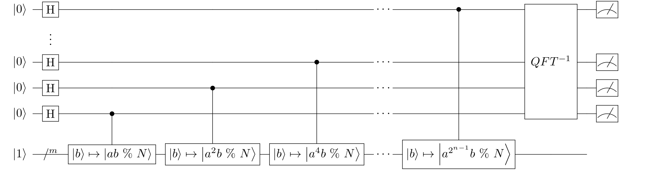 עכשיו אפשר לתאר את \(U\). כזכור, אלגוריתם מציאת הסדר מקבל כקלט מספר \(N\) ומספר \(a<N\) והשאלה היא מהו הסדר של \(a\) מודולו \(N\). אז האופרטור \(U\) שבו משתמשים נבנה בהתבסס על שני המספרים הללו: