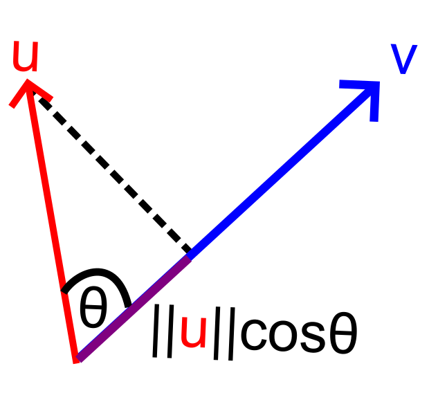 הנה עוד תזכורת על מכפלה סקלרית. מצד אחד, \(u\cdot v=\sum_{i=1}^{n}u_{i}v_{i}\) וזו דרך לחשוב על מכפלה סקלרית בתור איך בדיוק מחשבים אותה. מצד שני, אפשר להראות ש-\(u\cdot v=\|u\|\cdot\|v\|\cdot\cos\theta\) כש-\(\theta\) היא הזווית שבין שני הוקטורים. עכשיו, אפשר לחשוב על \(\|u\|\cdot\cos\theta\) בתור גודל ההיטל של \(u\) על הציר ש-\(v\) מגדיר - הנה דרך לדמיין את זה (החלק של \(v\) עד הקו המקווקו, שצבעתי בסגול, הוא מאורך \(\|u\|\cdot\cos\theta\)):