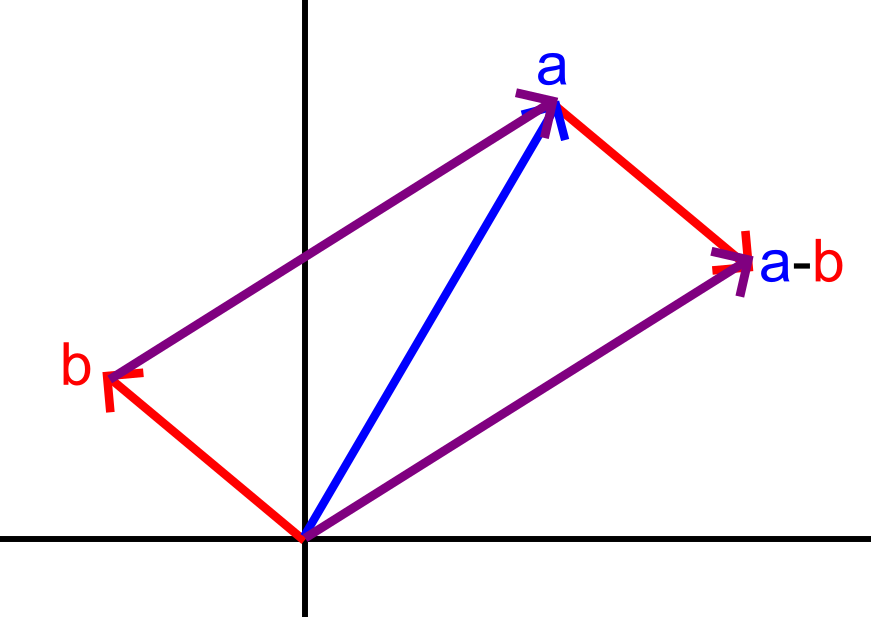 באיור הזה אני מצייר שתי נקודות \(a,b\), כשהוקטור אל \(a\) הוא כחול והוקטור אל \(b\) הוא אדום. הרעיון בכלל המקבילית הוא שכאשר אני מחבר שני וקטורים, אני מדביק עותק של כל אחד מהם לקצה של השני, כך שאני יוצאר מקבילית, והנקודה שבה שני העותקים הללו נפגשים היא הסכום. אצלנו אני מתעניין ב-\(a-b\) ולכן אני מצייר מקבילית שהוקטורים שבונים אותה הם \(b\) ו-\(a-b\) (שהוקטור שמתאים לו הוא סגול), ואפשר לראות איך אורך הוקטור של \(a-b\) (הקו הסגול התחתון יותר, שמחבר את \(a-b\) עם ראשית הצירים) זהה באורכו לקו הסגול העליון, שהוא מה שמחבר את \(b\) עם \(a\).