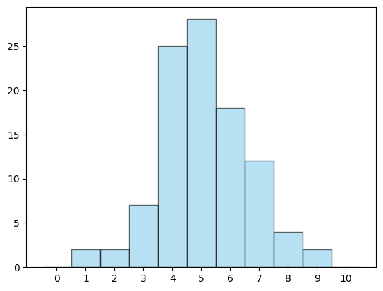 יש באיור הזה 11 פסים בגבהים שונים. כל פס מתאים למספר בין 0 ל-10: אלו בדיוק מספר הפעמים שבהן עץ יכול להתקבל כשמטילים מטבע עשר פעמים. הגובה של כל פס מתאים למספר המשחקים שבהם הוא יצא: אנחנו רואים שהעמוד של 5 הוא בערך בגובה 2,500, כלומר בערך ב-2,500 מהמשחקים (מתוך 10,000 בסך הכל) קיבלנו באמת 5 פעמים עץ. אז התוצאה 5 היא באמת הכי נפוצה, אבל היא לא לבד. רק ברבע מהמשחקים בערך קיבלנו אותה. בכלל, התמונה הזו היא די יפה. הפסים די סימטרים. אם מסתכלים טוב רואים הפרשים קטנים בגבהים בין פס 4 ו-6 למשל, אבל הם נראים די אותו דבר. הסיבה שזה עבד יפה היא שביקשתי מהמחשב לשחק 10,000 משחקים. כשאני מבקש ממנו רק 100, זה נראה ככה: