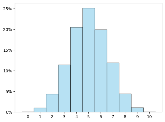 לפני שנגיע להגדרות הפורמליות, בואו נראה על מה אני מדבר ב"התפלגות נורמלית" ואיך זה "קירוב". נתחיל עם ההיסטוגרמה של ההתפלגות הבינומית שראינו בהתחלה: