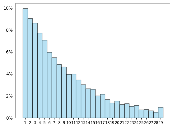 ההיסטוגרמה הזו משקפת לא רע את הניסוי "מטילים מטבע עשר פעמים וסופרים כמה פעמים קיבלנו עץ". עכשיו בואו נדבר על ניסוי אחר: אני מנסה לזרוק כדור לסל, וזורק שוב ושוב עד שאני סוף סוף קולע. הבעיה היא שאני גרוע בהשלכת כדורים לסל ולכן מצליח לקלוע רק בהסתברות של 1 ל-10. מה שכן, אני אדם מאוד רגוע ולכן גם אם פספסתי שלושים פעמים ואני לכאורה אמור להיות מעוצבן והידיים שלי אמורות לכאוב, בפועל עדיין יש לי את אותה הסתברות בדיוק לקלוע - 1 ל-10. ועכשיו השאלה היא - מה ההסתברות שאצליח לקלוע על הפעם הראשונה? אחרי שתי פעמים? שלוש? אם מבצעים 10,000 חזרות על הניסוי ומציירים היסטוגרמה, מקבלים: