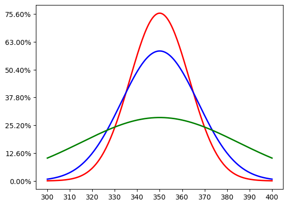 אם אני לוקח את שלושת הניסויים השונים הללו ועושה עליהם את מה שעשיתי בפוסט הראשון בסדרה, כלומר מצייר את העקומה של ההתפלגות הנורמלית שמקרבת את מה שמקבלים אם חוזרים על הניסוי 100 פעמים וסוכמים את התוצאות - זה מה שאני אקבל: